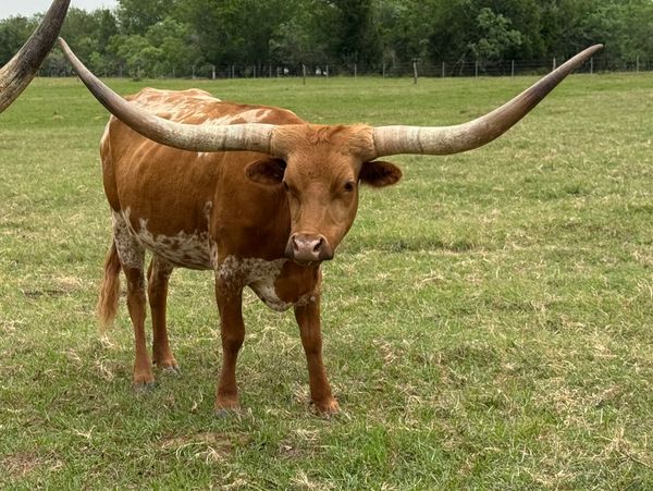 Suzy Q is the real deal, the total package, the whole kit 'n caboodle. She's got horns right at 80 inches TTT with base, body, and color. Her pedigree shows what you get when you take a great bodied, long-horned bull, and pair it with classic longhorn cow genetics. She is a looker!